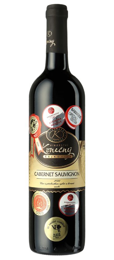 Cabernet Sauvignon od vinařství Konečný, je ročník 2022, suché červené tiché víno. Víno má granátovou barvu.