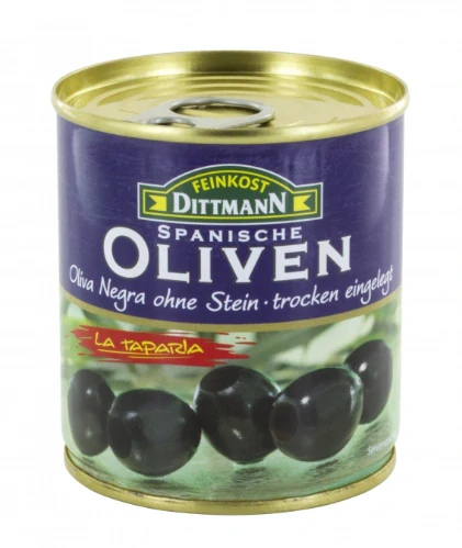 Delikatesní černé olivy bez pecky, sušené naložené, 85g, v plechovce.