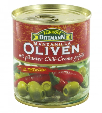 Delikatesní zelené olivy s chilli pastou bez pecky, 200ml/85g, v plechovce.